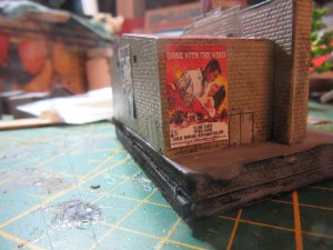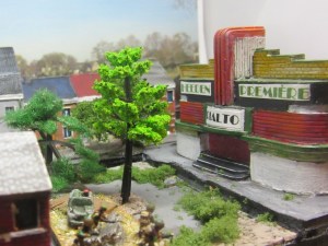 The cinema. Any self-respecting pre-war-city is not a pre-war- city without a cinema, and no 6mm-city builder can be a self-respecting wargamer without this Leven Miniatures art deco cinema. Here with home made Dutch signs and on a small scenic base. I base all my buildings on 80 or 40x40mm foamboard, preferably in groups and/or trees/bush.