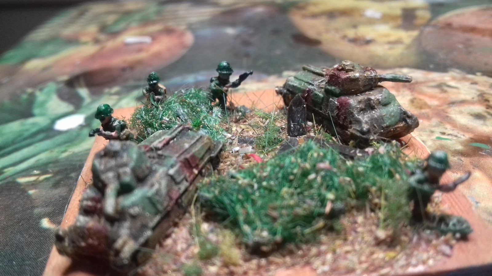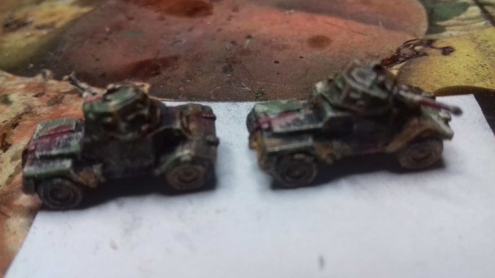 The vehicles (Heroics & Ros) were spraypainted medium brown, highlighted bone yellow, and finished with irregular patches of green and red brown.