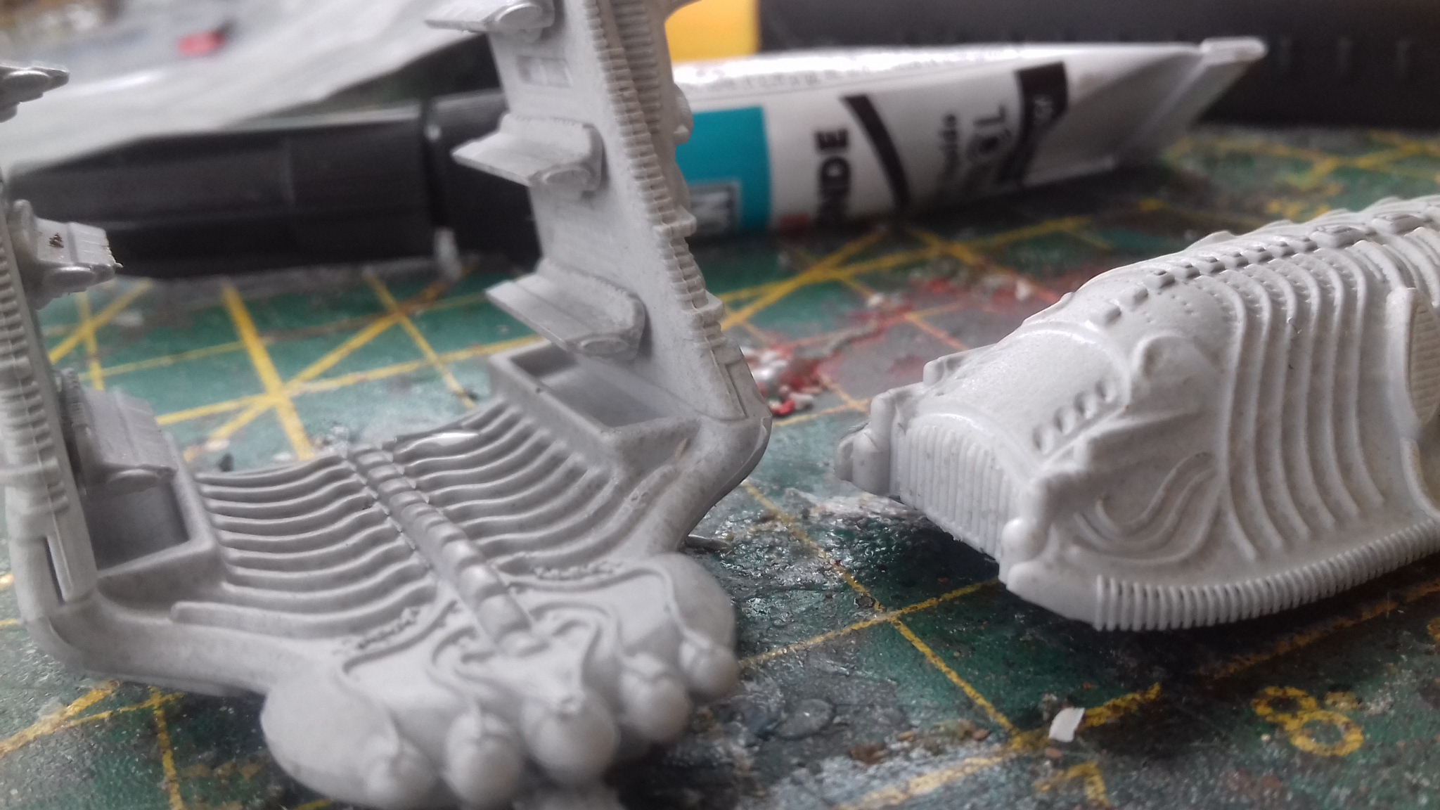 I primed the vehicles grey and basecoated them with GW’s Gehenna’s Gold. Busy now with orange and other details, and shiny purple. They must radiate evil, from the first moment they enter the board.