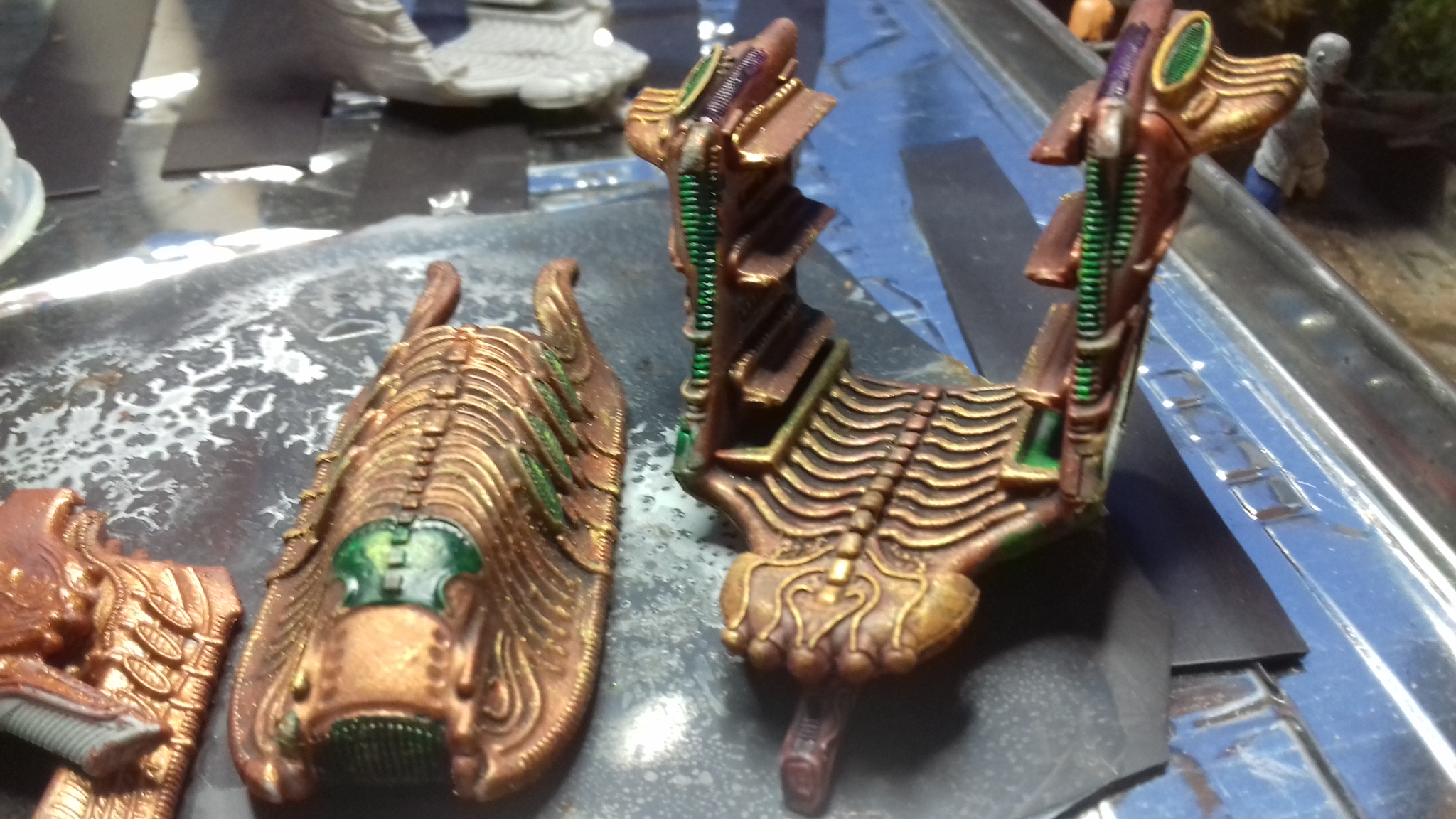 I liked that two-tone-yellow/orange-green approach. However the miniatures look reptilian and non-metallic. Orange, in metallic version, is gold or copper. In steampunk pictures it’s often combined with emerald green, the paler, the more evil it is. A few internet pics to give you an idea.