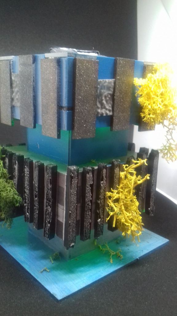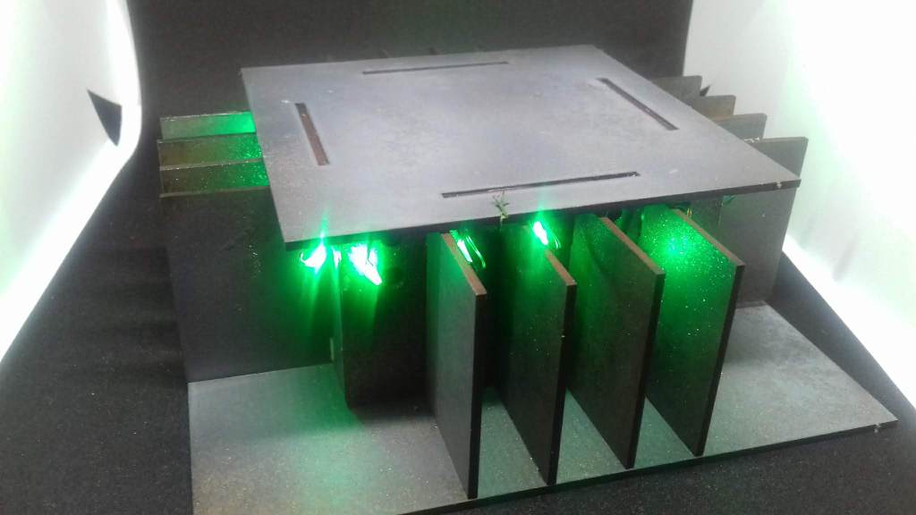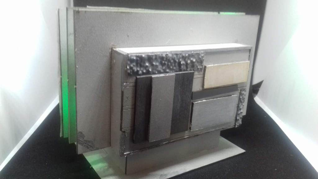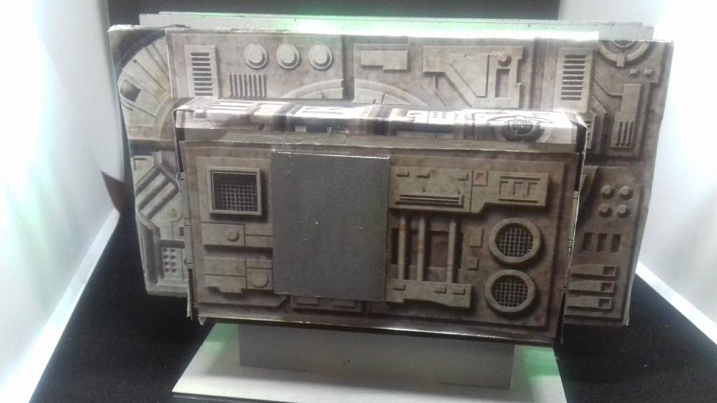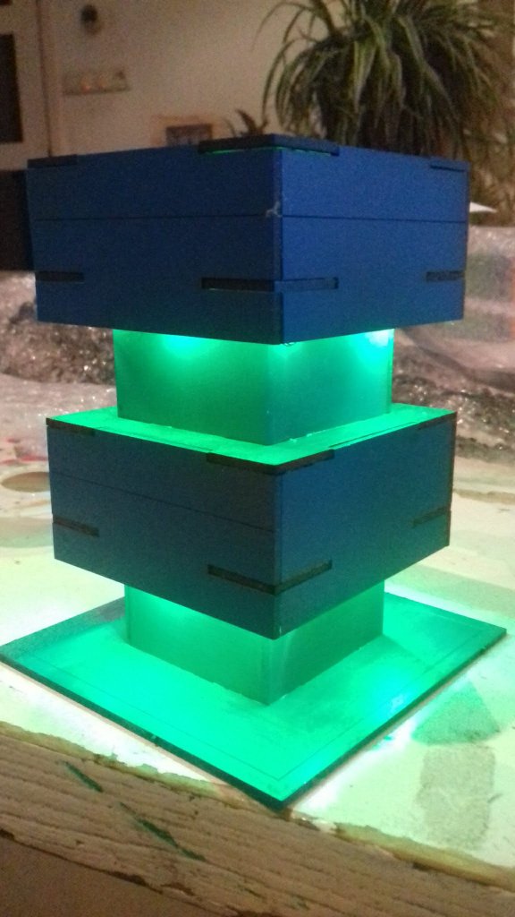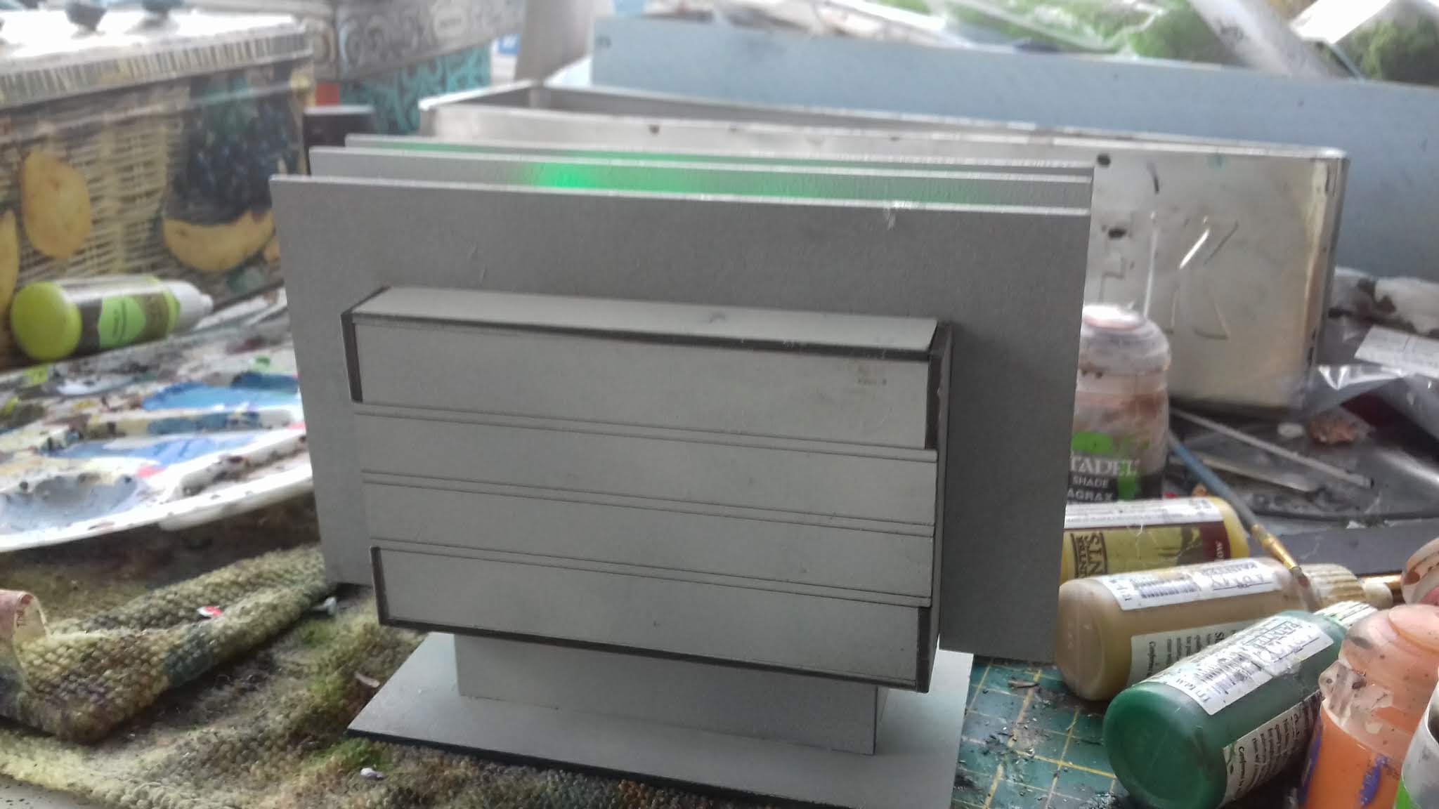 As you can see I modded the two objects above because they didn’t convince me, but they remained ‘desk lights’. Boxes. Flat boring stapled matchboxes with green led-lights. Even after modding they didn’t look ‘right’. I tried several different colours, glued panels, added paper prints, alien plants. It didn’t help.