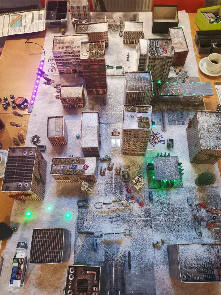 Just a few pics of a table I’m proud of. I’ve been busy with my Dropzone project since the summer, I think, finished my fourth faction, the Shaltari, a month ago. Today, January 4th 2020, I umpired our first multiplayer game which was good old fashioned science fiction fun. LEDS, artificial snow, street signs,I love it when a plan comes together! Happy New Year!