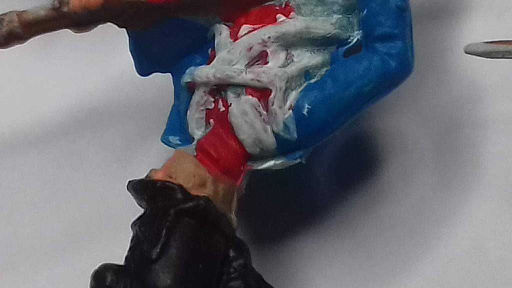 As you see this first layer is sloppy. I then sharpened the relief of the blue jacket and red front with blue and red contrast paint. The official method is to CP a white or grey primed colour, resulting in a pastel effect. Instead, I used CP to contrast and correct the flat medium blue and red painted jacket. The Contrast Paints fill gaps and holes.