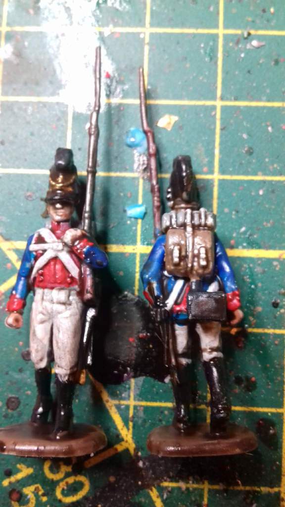 Next I removed them from the sprues, checked every miniature, corrected mistakes and painted finer details like barrels, gold helmet lacing, and white rucksack straps. Then I slapped the (mid-tone) Quickshade on the figures.