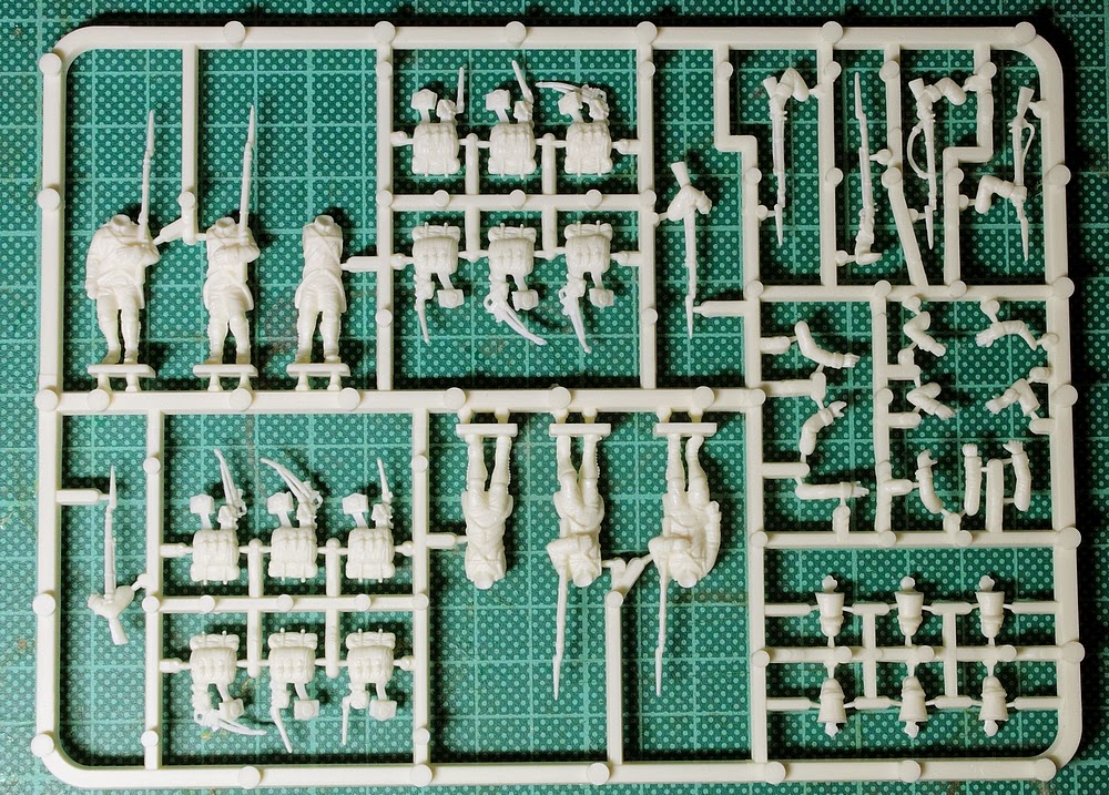 A very big difference with other manufacturers is the number of separate parts. HäT provides a complete figure with a separate backpack and an optional plume. That’s all. Compare the sprue above with the Victrix Austrians below, with separate heads, arms and rifles.