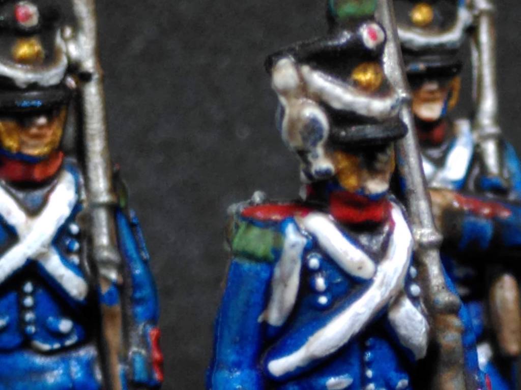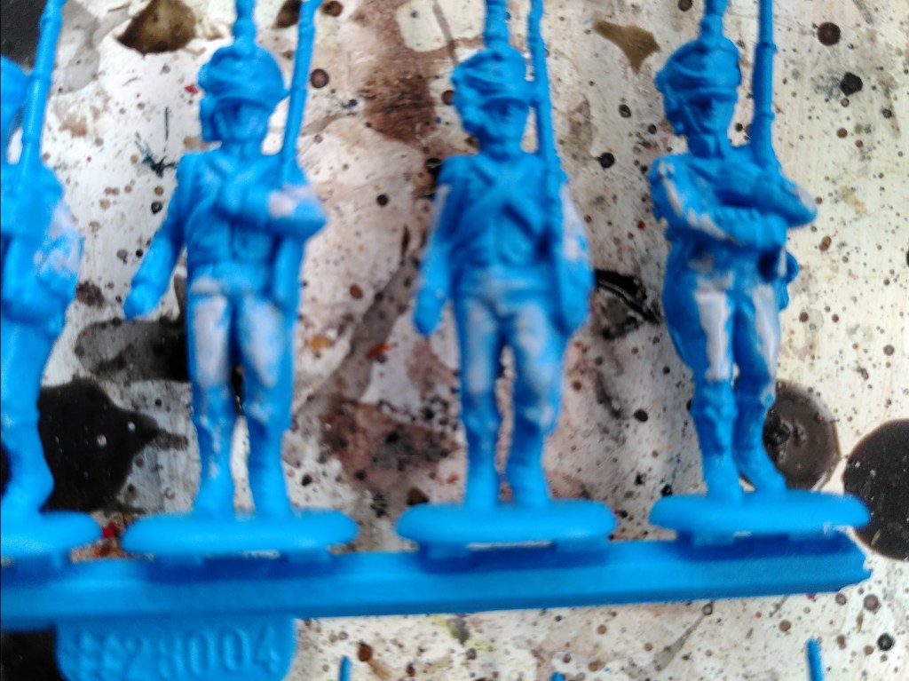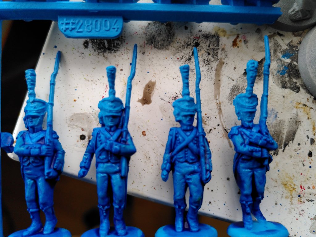 I primed them mid blue (Army Painter Crystal Blue). Next step was pre-highlighting and then contrast painting them. A dash of light grey on the trousers, dark grey on shako front and top. And a rain of Tallasar dark blue contrast paint all over. Raindrops kept falling on their heads.