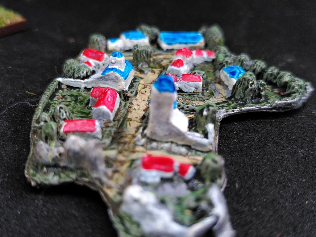 Brigade models BTW have beautiful historical 2mm Waterloo buildings for the true fan. The Forward March blog shows impressive examples how to make quality 2mm battle mats, and a perfect tutorial for large 3D 6×6 plexiglas battlefields. I admire the results, but I wanted a portable wargame, remember? So I stick to my light bring-along-battlemat with a patchwork pattern of fields on it. See below.