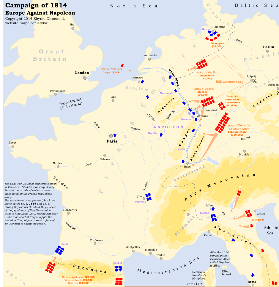 Napoleon however then surprised Blücher and Schwarzenberg with a series of swift counterattacks in the following famous Six Day’s Campaign. First Blücher: battles vs the Prusso-Russians of Champaubert, 10 February 1814; Montmirail, 11 February, Château-Thierry, 12 February; Vauchamps, 14 February.