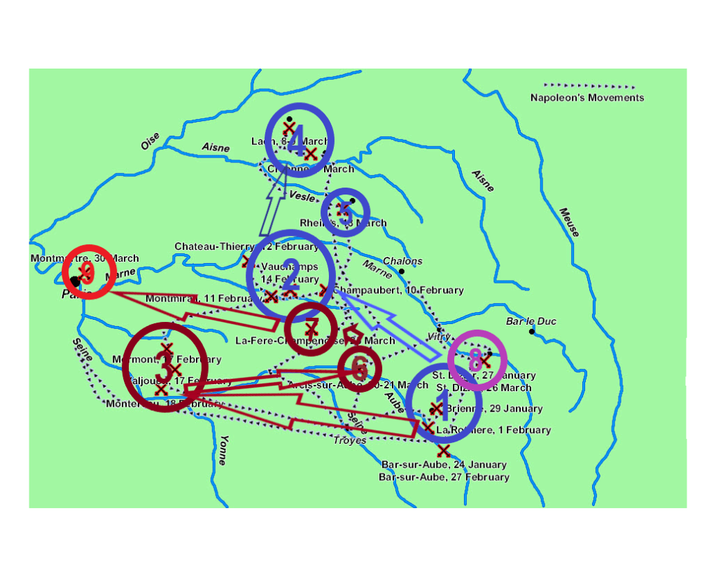 - The first battles were between Napoleon and a combined Prussian/Austrian force near Brienne and La Rothière (1) 29 January/2 February. Napoleon couldn’t stop that force, only slow down.