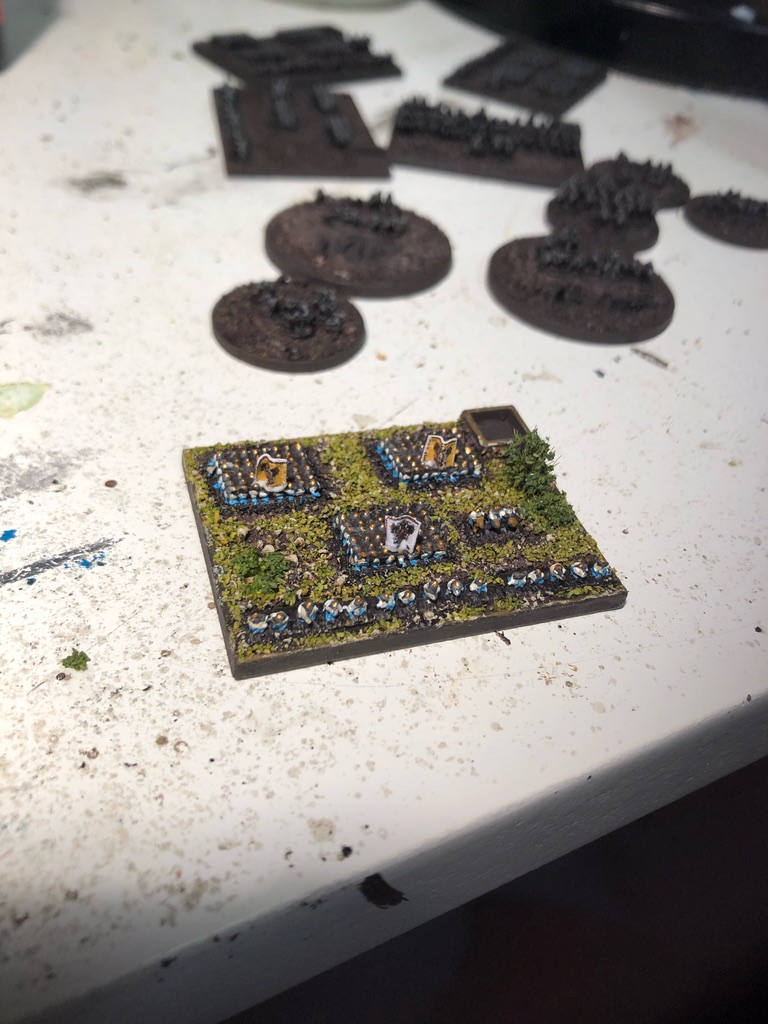 This will be some hungarian infantry, so I paint some light blue dots where the trousers are supposed to be. The important part is to leave some brown undercoat between each soldiers trousers. This is essential in my view to trick the eye to see individual soldiers from far away.