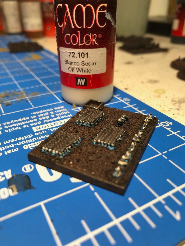 Give the base a bone colored lighter drybrush. Do you notice how the figures suddenly disappear within the light colored base? The picture before had a better look I think. But this will change again when we flock the base.