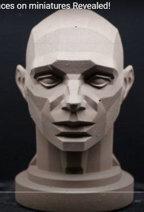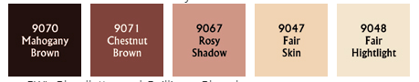 D Powell from Wamp primes the head, basecoats with medium flesh (Vallejo Rosy Shadow), shadowed the eyes ( “No sense spending an hour to get the eyes right only for a quick slip with your skin shadow to ruin it all”). Chestnut Brown around the eyes, under the cheeks, nose, and chin, and then around the mouth. Dark (Mahogany) Brown is used to further deepen the shadows under the brows, in the nostrils, and under the chin.