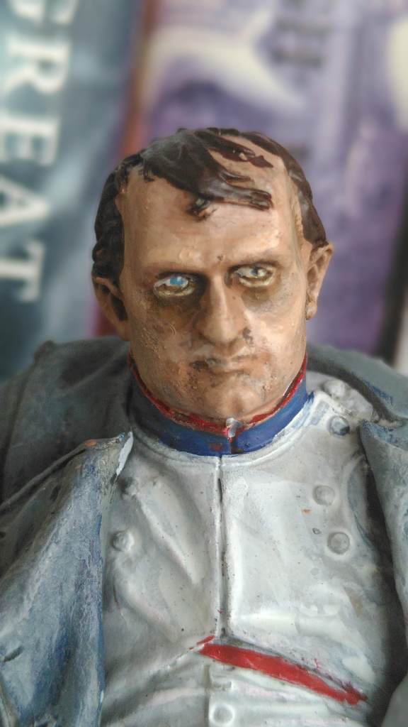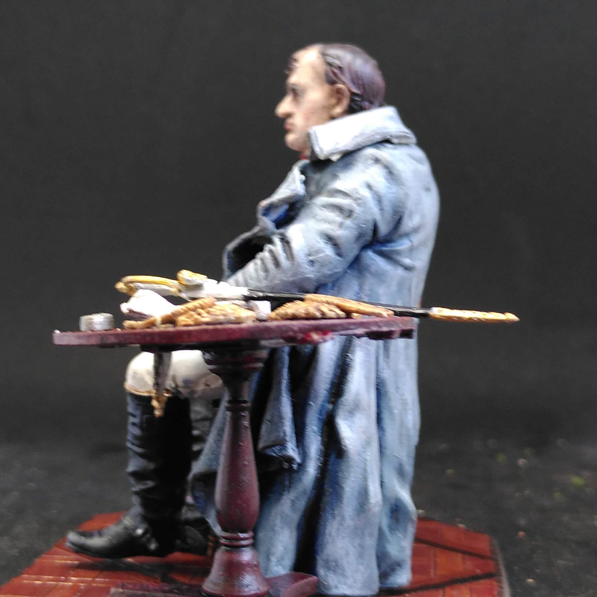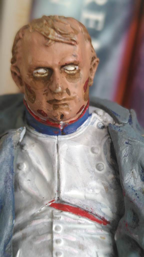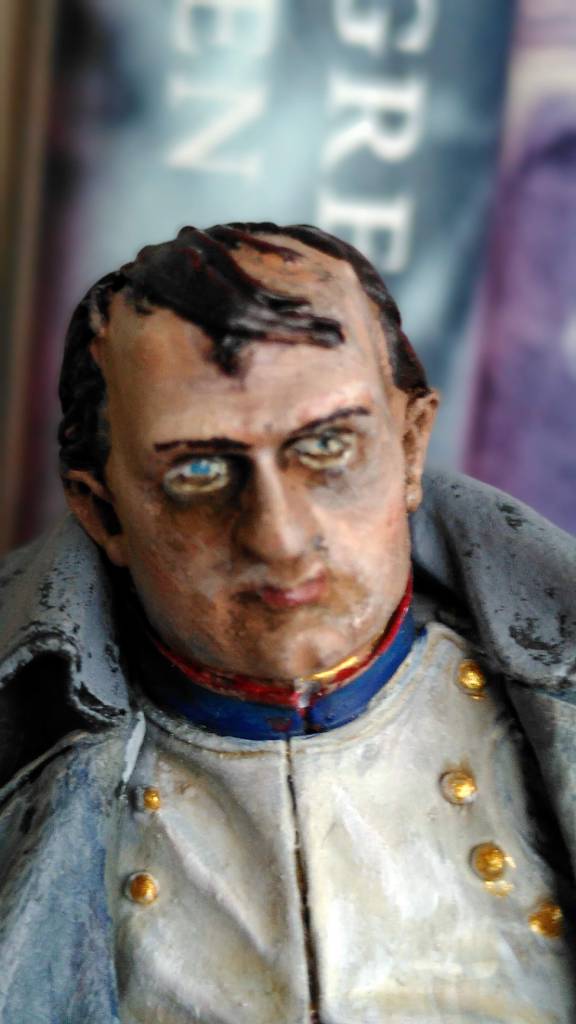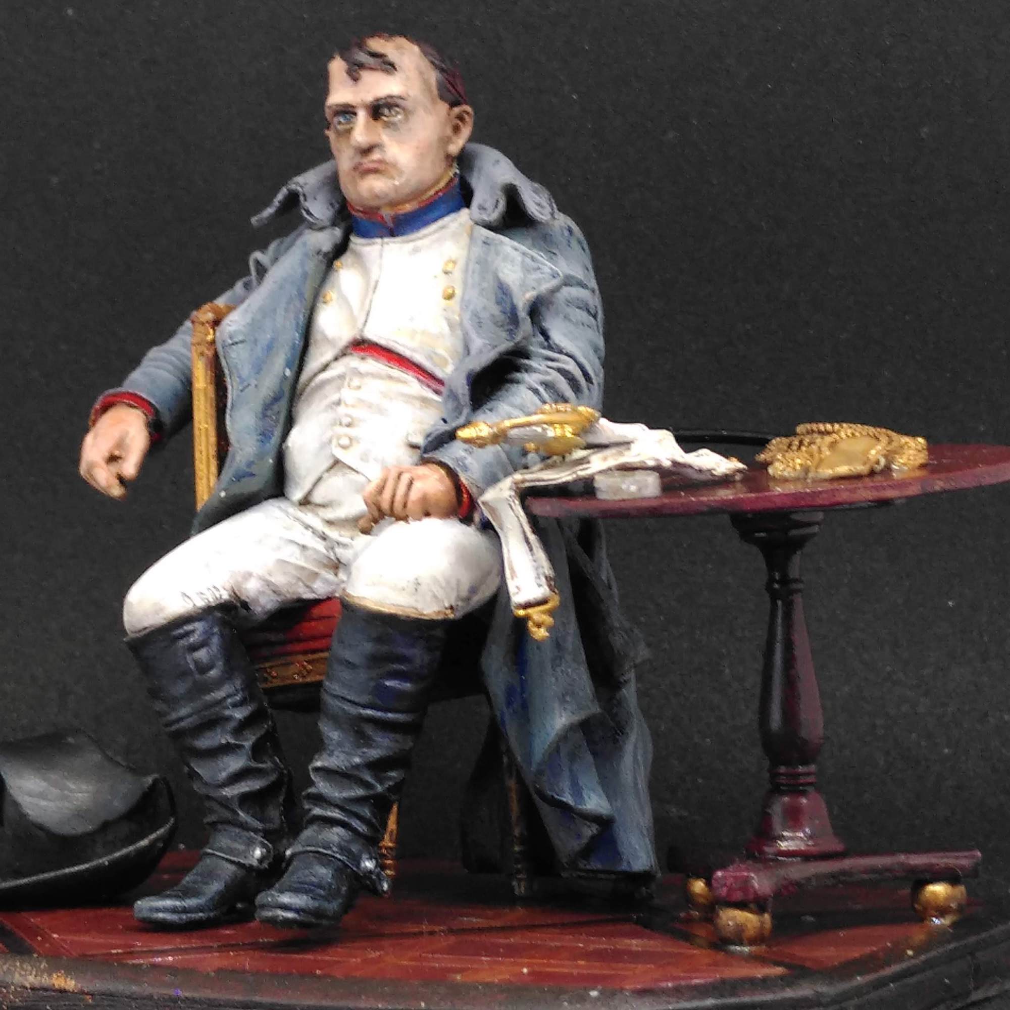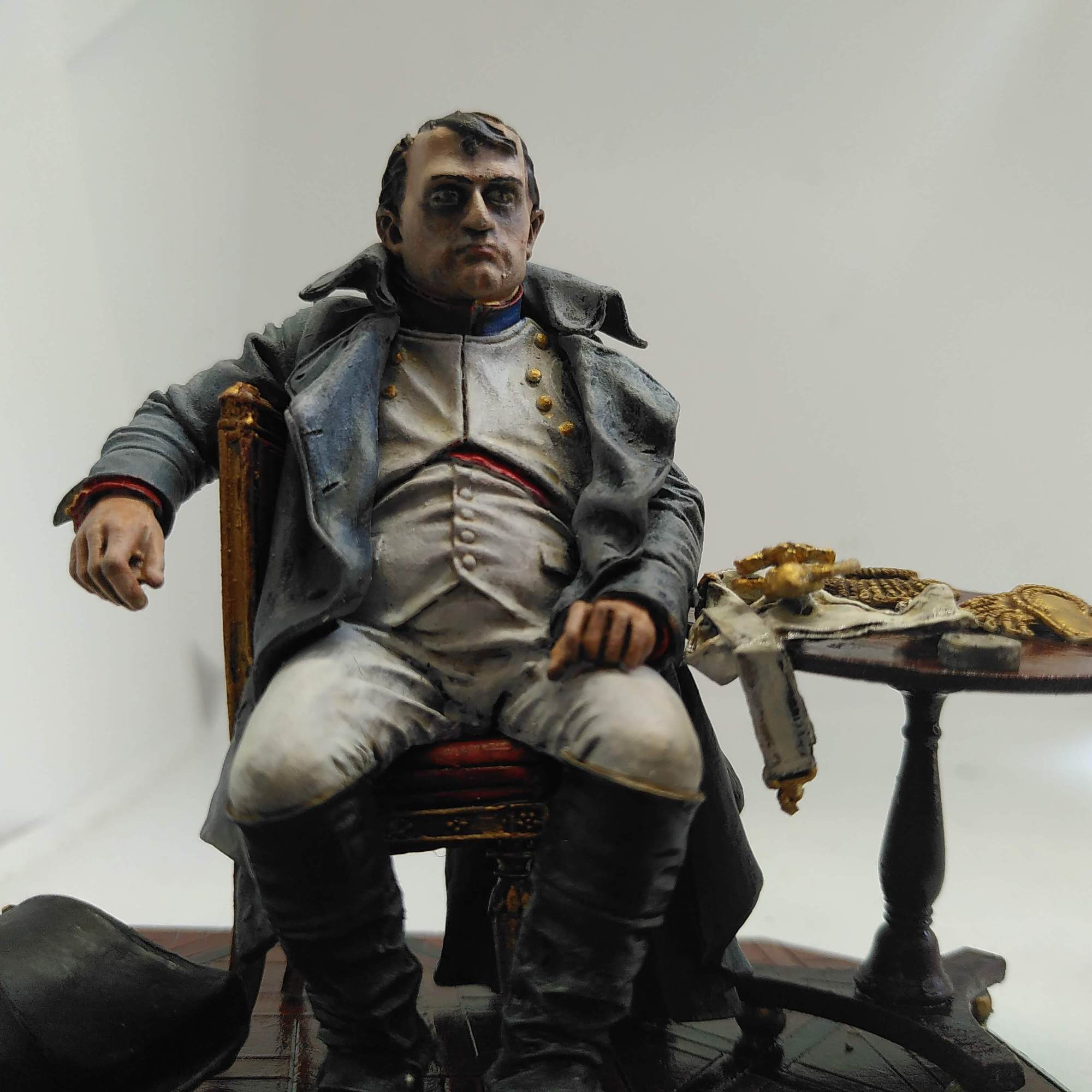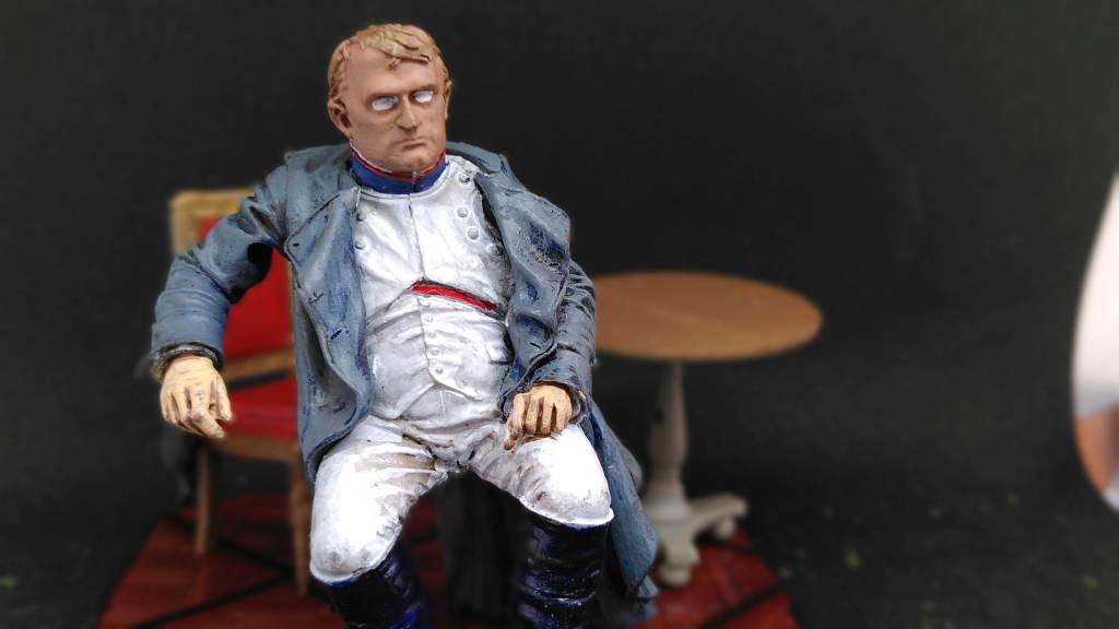 Tunic and trousers are grey primer/white drybrush/dark wash – but that looked like a Napoleon in dirty laundry – so I finished with some more off-white/brown wash/off white drybrush/white highlights. Hands in the same pale colour as the face. I highlighted the boots with brown and grey and Army Painter dull coated Napoleon. The hat was simple.