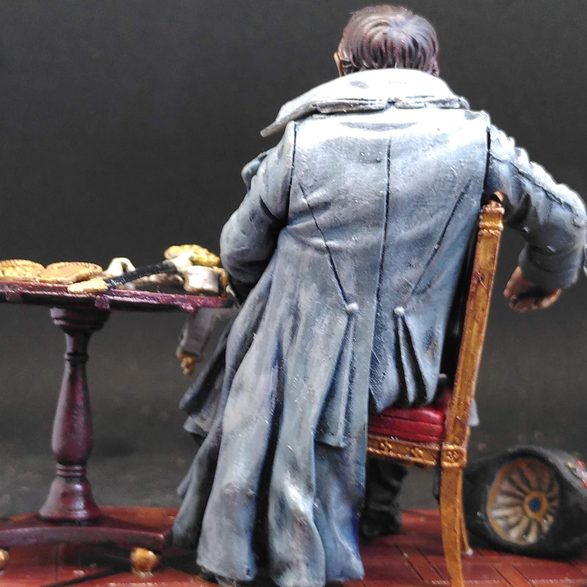 I originally had blockpainted the coat mid grey, with a blue wash, and then a dark wash, for the deepest shadows, for an Andrea/Marlon Brando navy grey. Seven years ago that seemed right, now I corrected that with a lighter grey drybrush and off-white tones.