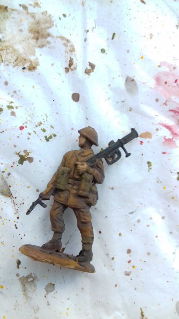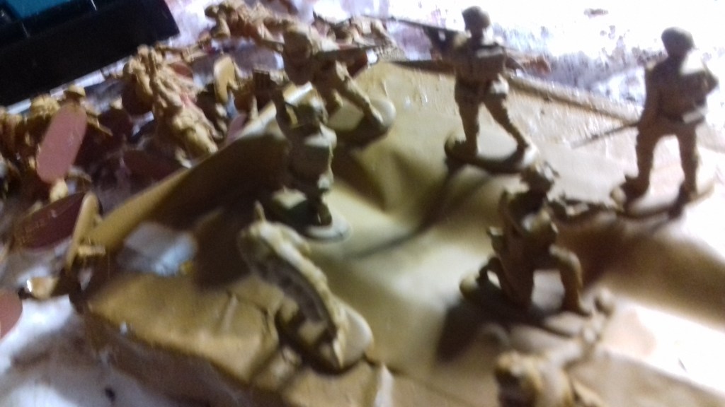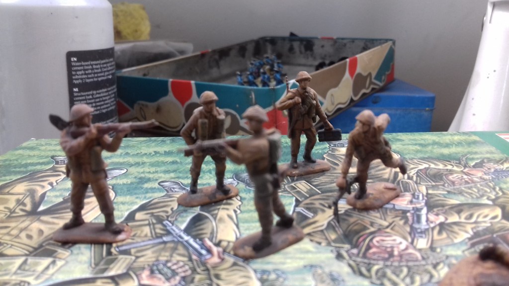 I frantically painted them, quick & dirty, 39 miniatures in 3 hours. Brown undercoat, flesh, khaki backpacks, black boots, brown rifles, Army Painter dip. That’s it.