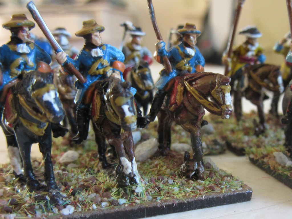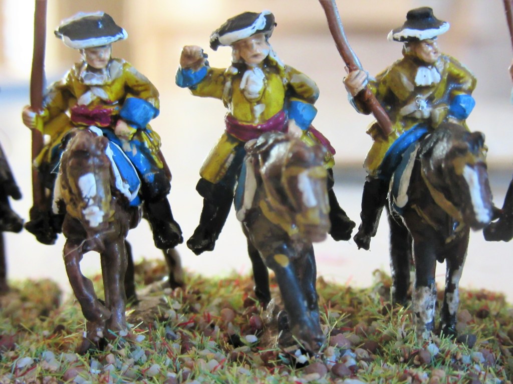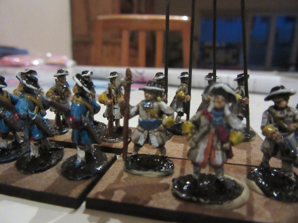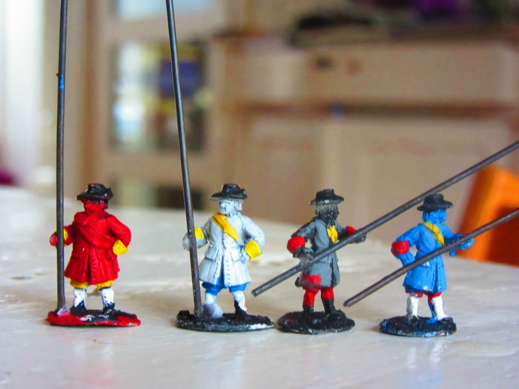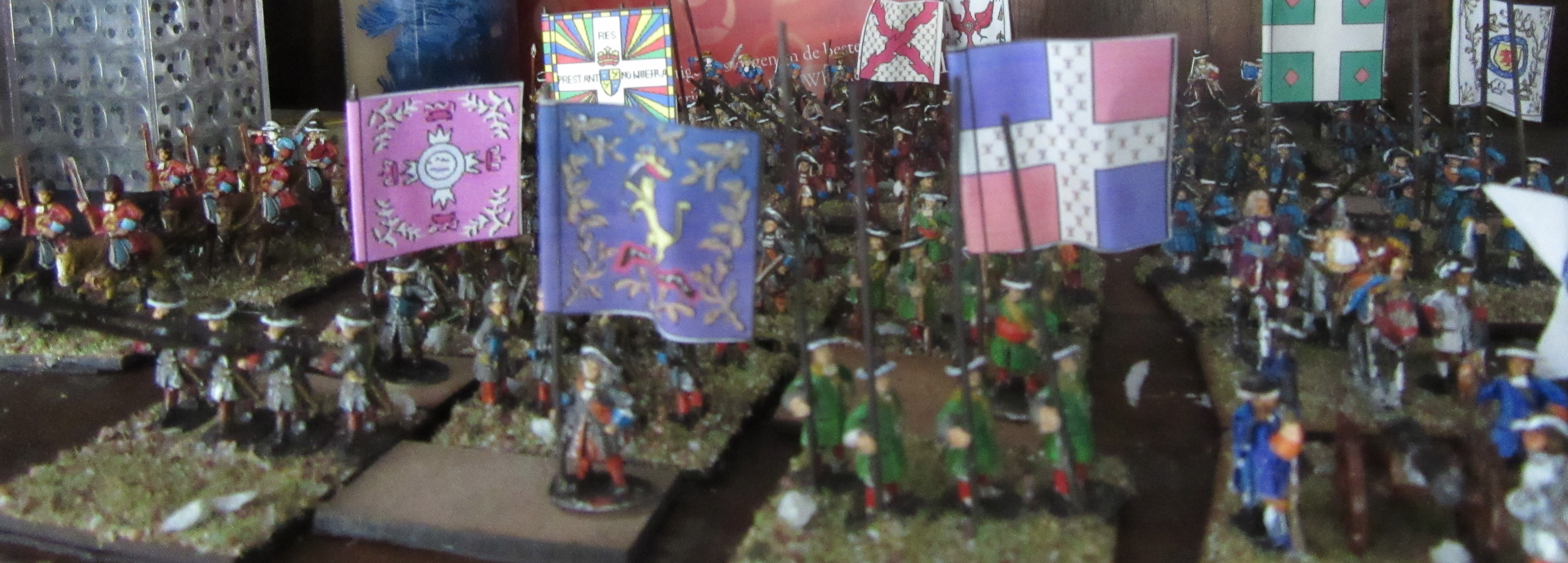 Again: no real need for historical precision. Sure, ‘exact’ (so to say) colours can be found on the web. But on the wargames table you see red-blue and blue-red and grey units. So, being practical, I painted 1 unit red, 1 unit blue, 1 unit grey and 1 unit yellow. The only relevant historical detail is the hat colour of the Dutch Blue Guard: buff.