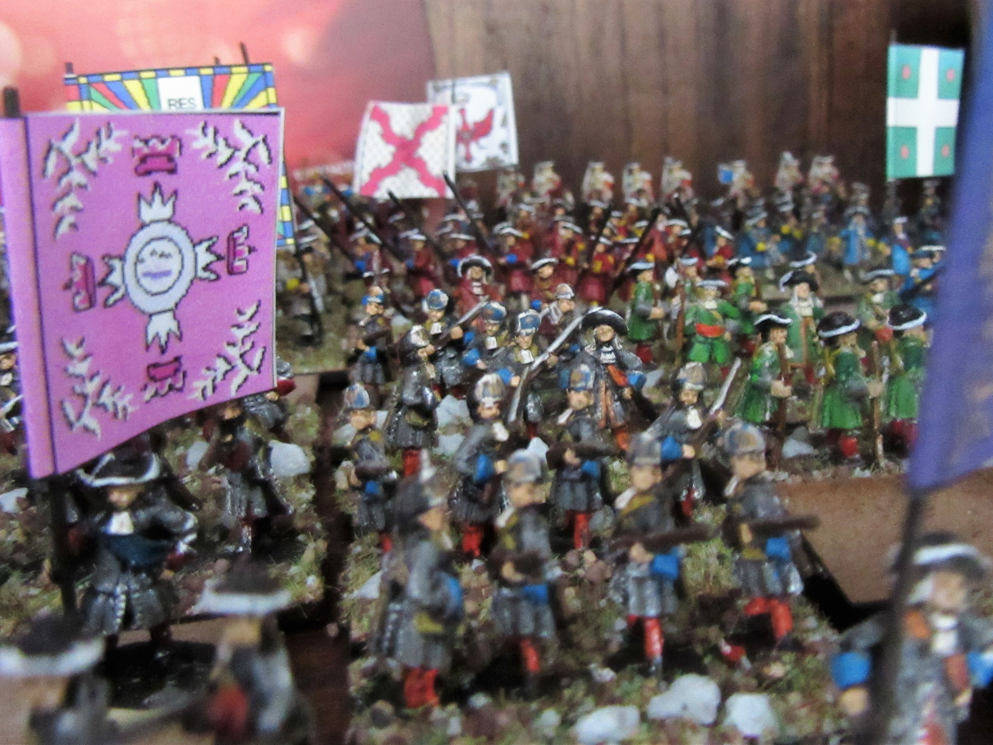 I like gaming more than painting, in particular painting big armies – that can even be a chore sometimes. So I looked for ways to cut corners. First, I dumped all ‘historical accuracy’ pretense. As said, all armies fought in the same colourful red, blue and grey uniforms. Barry Hilton who runs the League of Augsburg website published a useful painting guide, download it. A few examples: