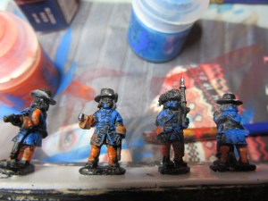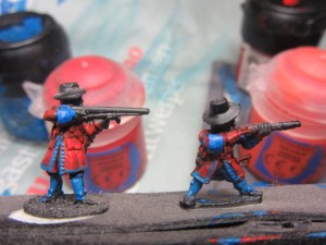 I painted the Essex/Irregular unit as Garde Suisse (but in fact they can pose as any red/blue musketeer unit from any nation, the combination was quite usual). Painting small details (like buttons) on Irregular was just as easy as painting Essex. I painted the Lurkio set as the famous Dutch ‘Blauwe Garde’, King William’s commando troops. As expected, the Lurkio elevated details are easier painting than Essex/Irregular, often small drybrushing was enough to colour the lace.