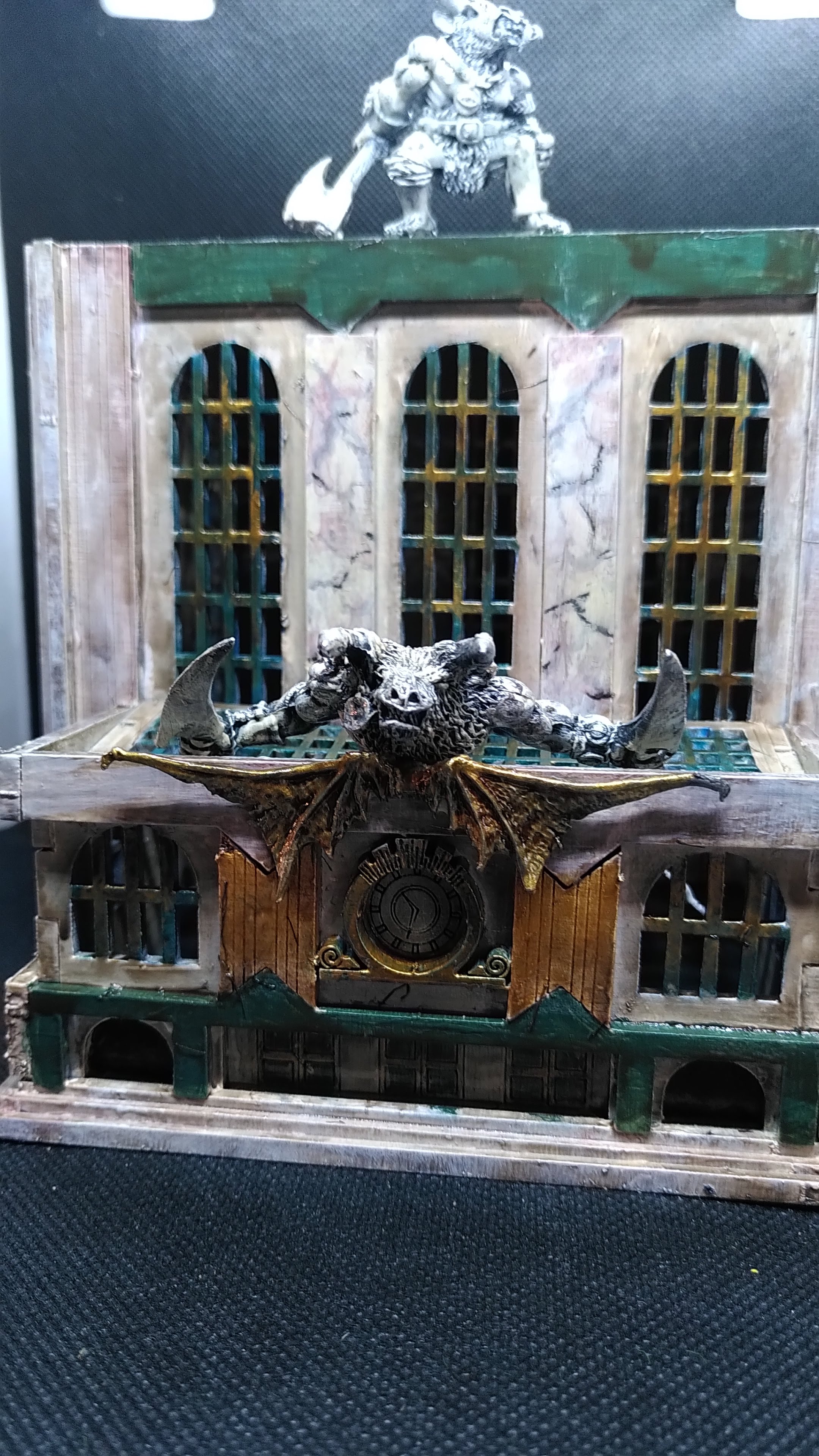 The building is now exactly what I want: grotesque, very Arkham art deco, a nice eyecatcher on the table. I think I’ll add lichen to give it a more decayed, Fall of the House of Usher-look.