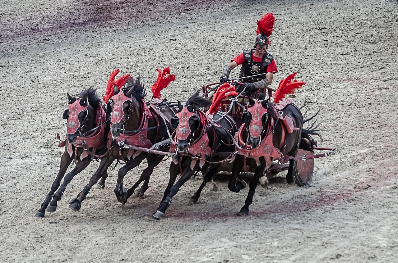 “In chariot fighting the Britons begin by driving all over the field hurling javelins, and generally the terror inspired by the horses and the noise of the wheels are sufficient to throw their opponents’ ranks into disorder. Then, after making their way between the squadrons of their own cavalry, they jump down from the chariot and engage on foot. In the meantime their charioteers retire a short distance from the battle and place the chariots in such a position that their masters, if hard pressed by numbers, have an easy means of retreat to their own lines. Thus they combine the mobility of cavalry with the staying power of infantry; and by daily training and practice they attain such proficiency that even on a steep incline they are able to control the horses at full gallop, and to check and turn them in a moment. They can run along the chariot pole, stand on the yoke, and get back into the chariot as quick as lightning” (Gallic War, IV.33).
