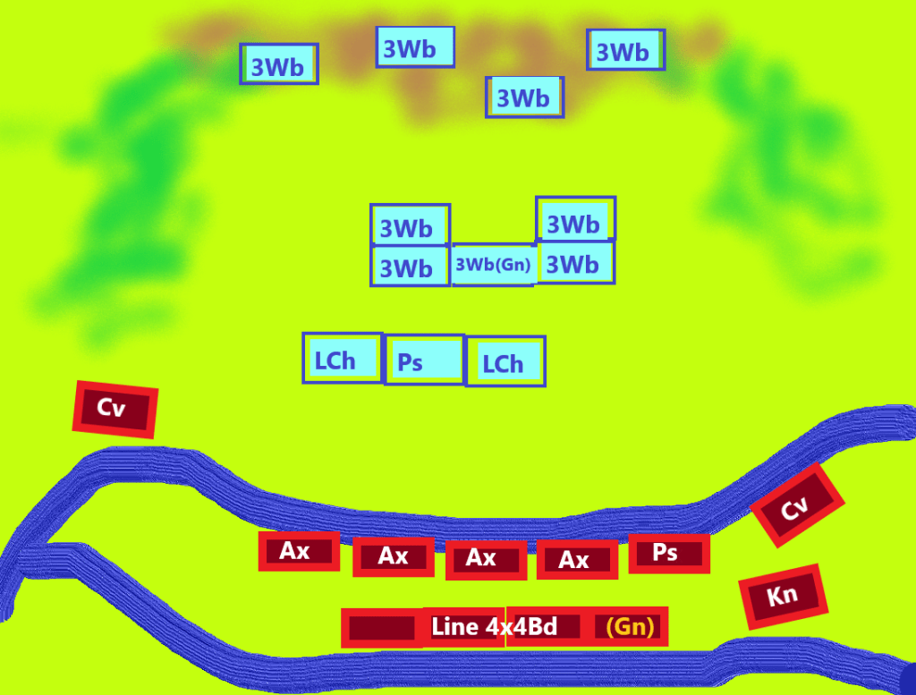 Me and my DBA opponent Henrique played this battle two times in the standard DBA version. Henrique played it first as solo game.